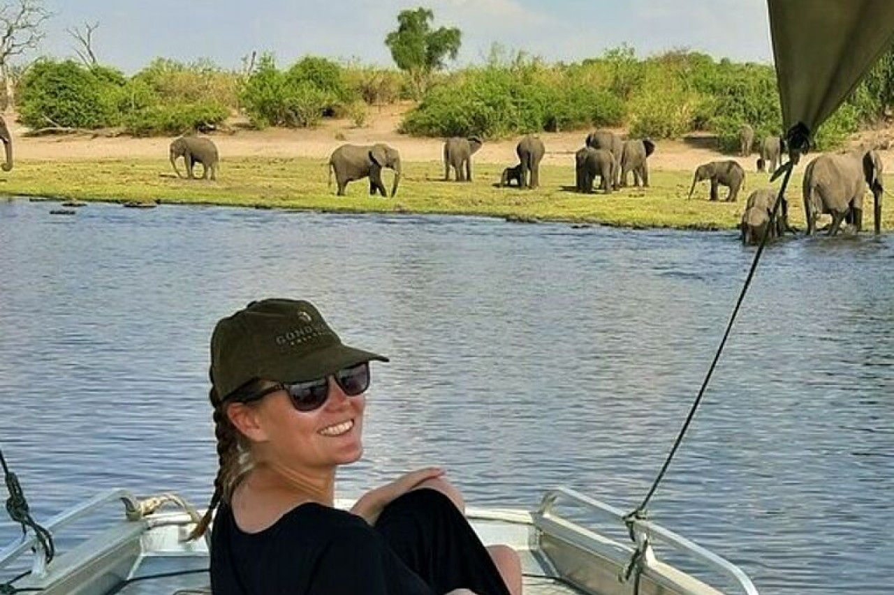 In der Wasserader vor unserem Camp spiegeln sich die Bäume wider, die leicht im Wind schunkeln. Die Sonne geht in weiter Ferne unter und verwandelt das Land in magische Farben. Nach dem Abendessen bin ich bereit, meine erste Nacht im Busch zu verbringen und freue mich auf mein Bett. Ich verbringe diese erste Nacht jedoch nicht alleine: gegen Mitternacht entscheiden die Elefanten, dass die Bäume direkt neben meinem Zelt am leckersten sind und verbleiben die Nacht dort. Immer wieder werde ich vom Klang zerbrechender Äste und vom Kauen der sanften Riesen aus dem Schlaf geholt. So wird man jedoch gerne geweckt. Im Delta nimmt mich der Guide auf eine Fußpirsch und eine weitere Mokorofahrt mit. Die Farben der Region sind trotz der Trockenzeit sensationell.