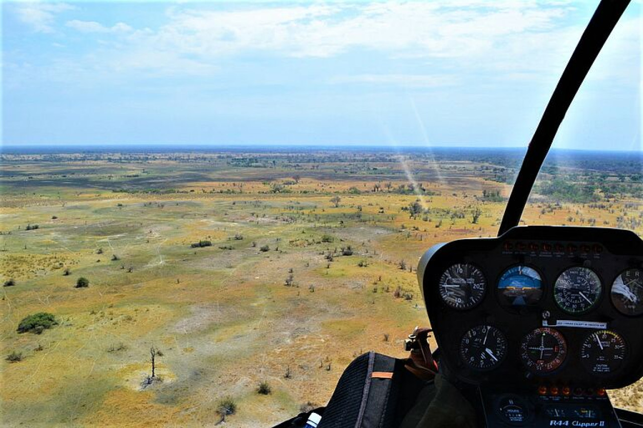 Nach zwei Tagen im Delta gelange ich per Mokoro wieder zurück in die Nähe von Maun. Von wo aus die Reise mit dem Geländewagen weiter geht. Bevor es jedoch ins nächste Camp geht, geht es noch hoch hinaus: mit einem offenen Helikopter darf ich das Delta noch einmal aus einer neuen Perspektive erleben. Wir sehen Elefantenherden durch das Wasser laufen, Schwärme von Vögeln über das Land ziehen und Giraffen unter uns her galoppieren. Selten durfte ich so etwas Besonderes erleben!